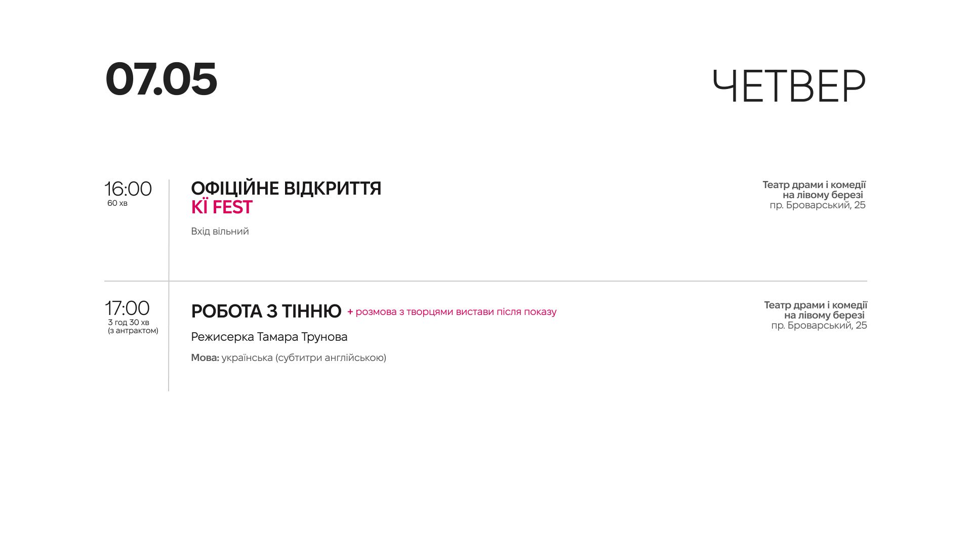 Фестиваль відкриється 7 травня виставою "Робота з тінню" режисерки Тамари Трунової, що покажуть у Театр на Лівому березі.