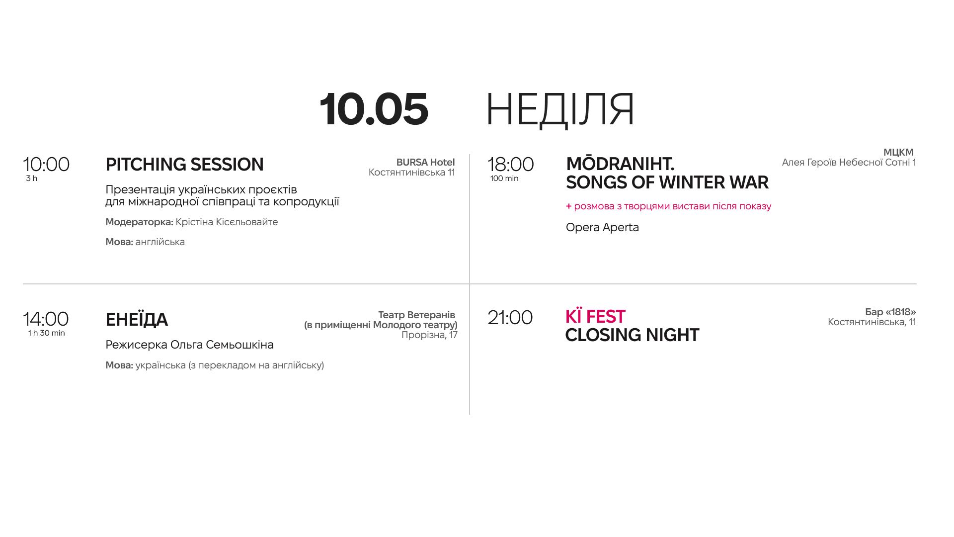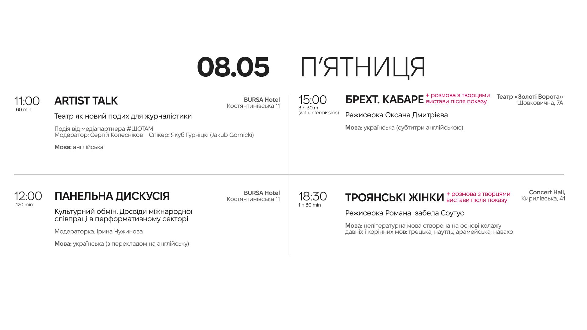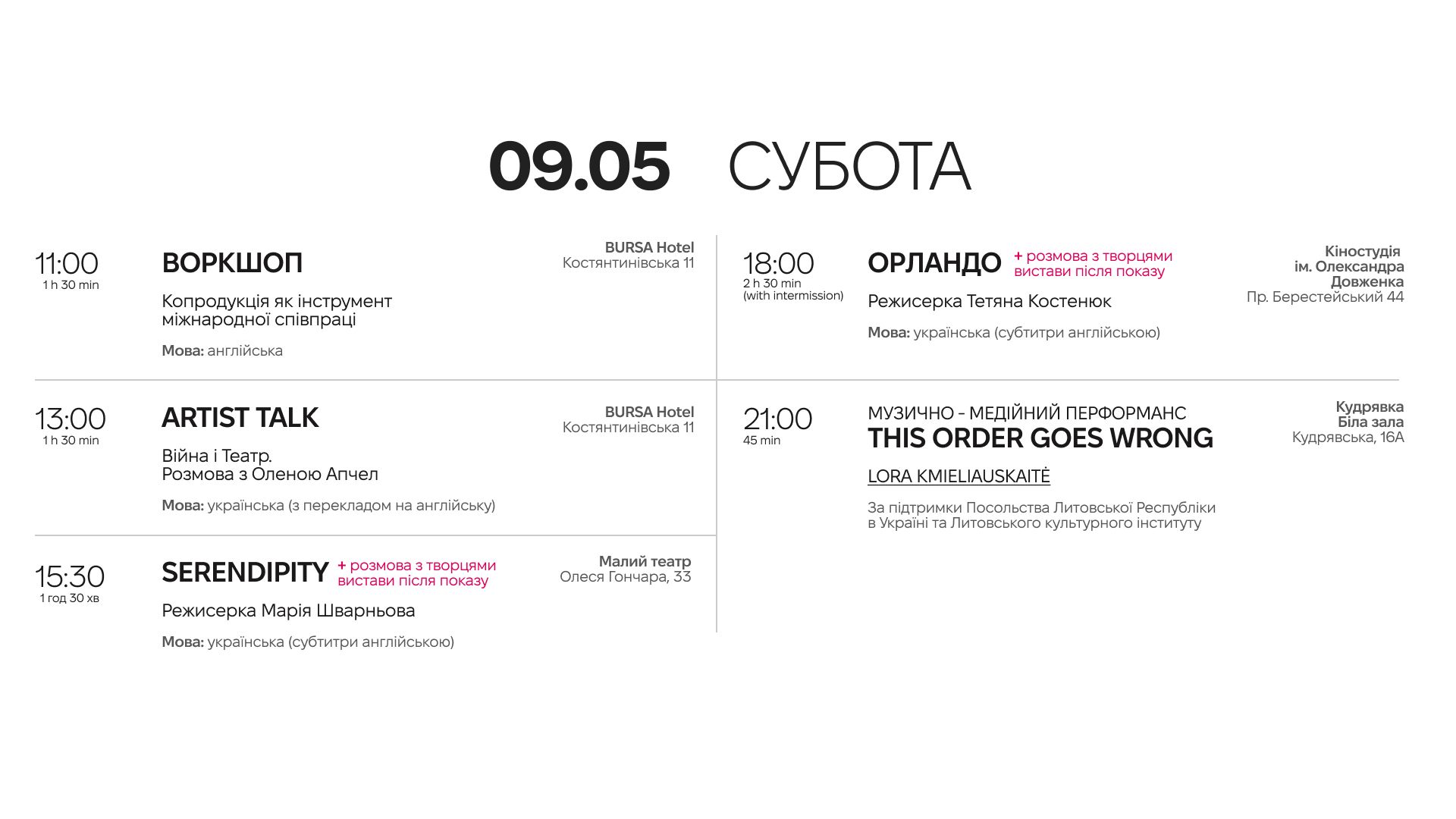 Усі вистави матимуть англійські субтитри. Паралельно з показами відбудуться публічні дискусії, воркшопи та пітчинг для режисерів і продюсерів за участі кураторів і директорів фестивалів з Великої Британії, Німеччини, Польщі, Литви, Латвії, Фінляндії, Чехії та Австрії. Квитки на вистави вже доступні, реєстрацію на публічні події відкриють наприкінці квітня.