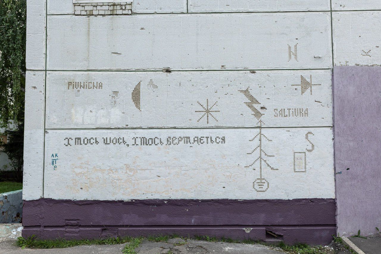 Віталій Кохан створив роботу винайденим ним же "шрифтом", яку підгледів у Харкові 10 років тому. Він вибивав маленьку квадратну плитку з пошкодженого фасаду будівлі.