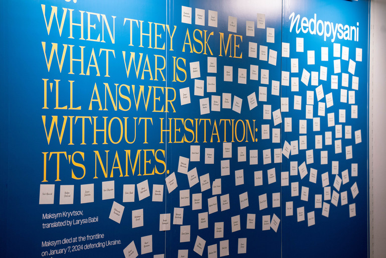 Видавцям, чиновникам, підприємцям, журналістам чи простим відвідувачам ярмарку ми пропонували долучитися до вшанування пам’яті наших літераторів. Ми привезли із собою 263 стікерів з іменами загиблих поетів та письменників. І пропонували відвідувачам – приклейте стікер із іменем на пам’ять про людину яка вже ніколи не зможе дописати свою нову книгу. Це частина проекту "недописані", створеного Оленою Герасим’юк – поеткою та ветеранкою війни.