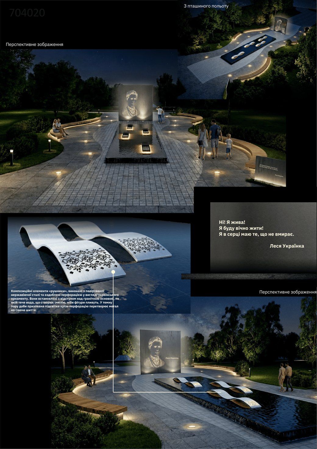 Перше місце здобув проєкт скульптора Миколи Білика та архітекторів Андрія Корструби, Марії Матушенко й Олександра Вовка. Проєкт передбачає встановлення бронзової фігури поетки на гранітному постаменті загальною висотою 4,7 метра. Розташувати його планують у сквері імені Лесі Українки з мінімальним втручанням в існуюче планування скверу.