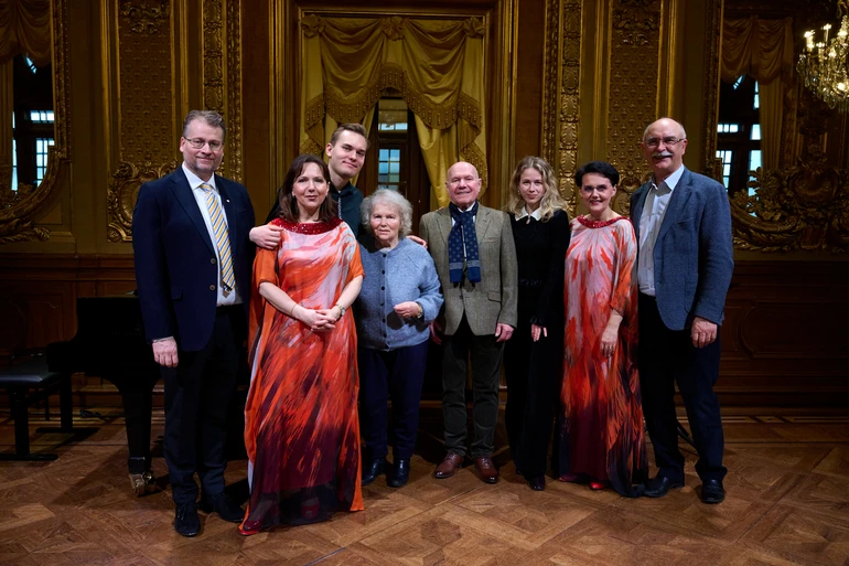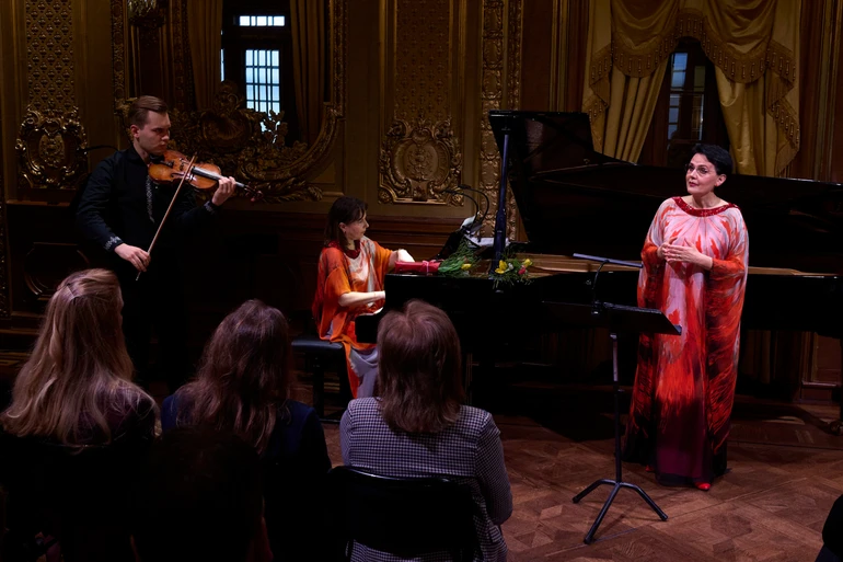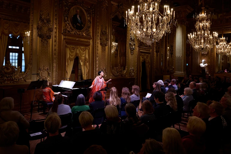 Всередині, однак, усе інакше: замість холоду й свинцевої сірости мене зустрічає тепло, пурпурові килими й царство позолоти й мармуру. Золоте фоє, в якому проходить концерт "Від Моцарта до Сильвестрова", виділяється навіть на тлі решти розкішних інтер'єрів театру: зала рясніє золоченою ліпниною, ошатними люстрами, дзеркалами й розписами Карла Ларссона. 120 стільців, розставлених у залі, швидко наповнюються, навіть попри те, що платний концерт відбувається о другій годині дня у вівторок.