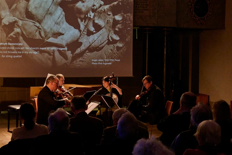 Попри буремні обставини життя й післяжиття митців, їхні роботи — ті, що попри все до нас дійшли, — промовляють красномовніше за будь-які слова. Анна показує фото й 3D-скани скульптур Пінзеля, і на цьому тлі музична програма отримує додатковий вимір. Першим виконують неспішне ґраве з сонати для скрипки й basso continuo до мажор Березовського. І це найближчий до чистого блаженства досвід вечора.