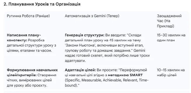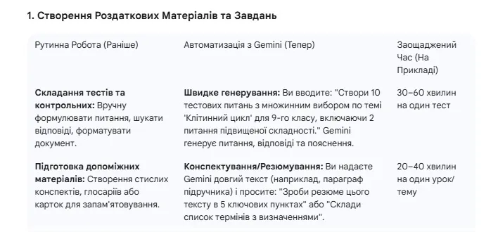 Генерація шаблонів: створіть 5-6 шаблонів (наприклад, "Урок-дискусія", "Лабораторна робота", "Проєктне навчання"). Gemini може заповнювати ці шаблони новим контентом: "Візьми мій шаблон "Урок-дискусія" і наповни його матеріалом про екологічні проблеми, додавши 4 суперечливі тези для обговорення".