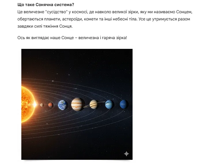 Генерація (за допомогою інших інструментів ШІ, інтегрованих з Gemini): Gemini може генерувати зображення (діаграми, прості ілюстрації) за вашим запитом, що є простішою альтернативою ручному пошуку.