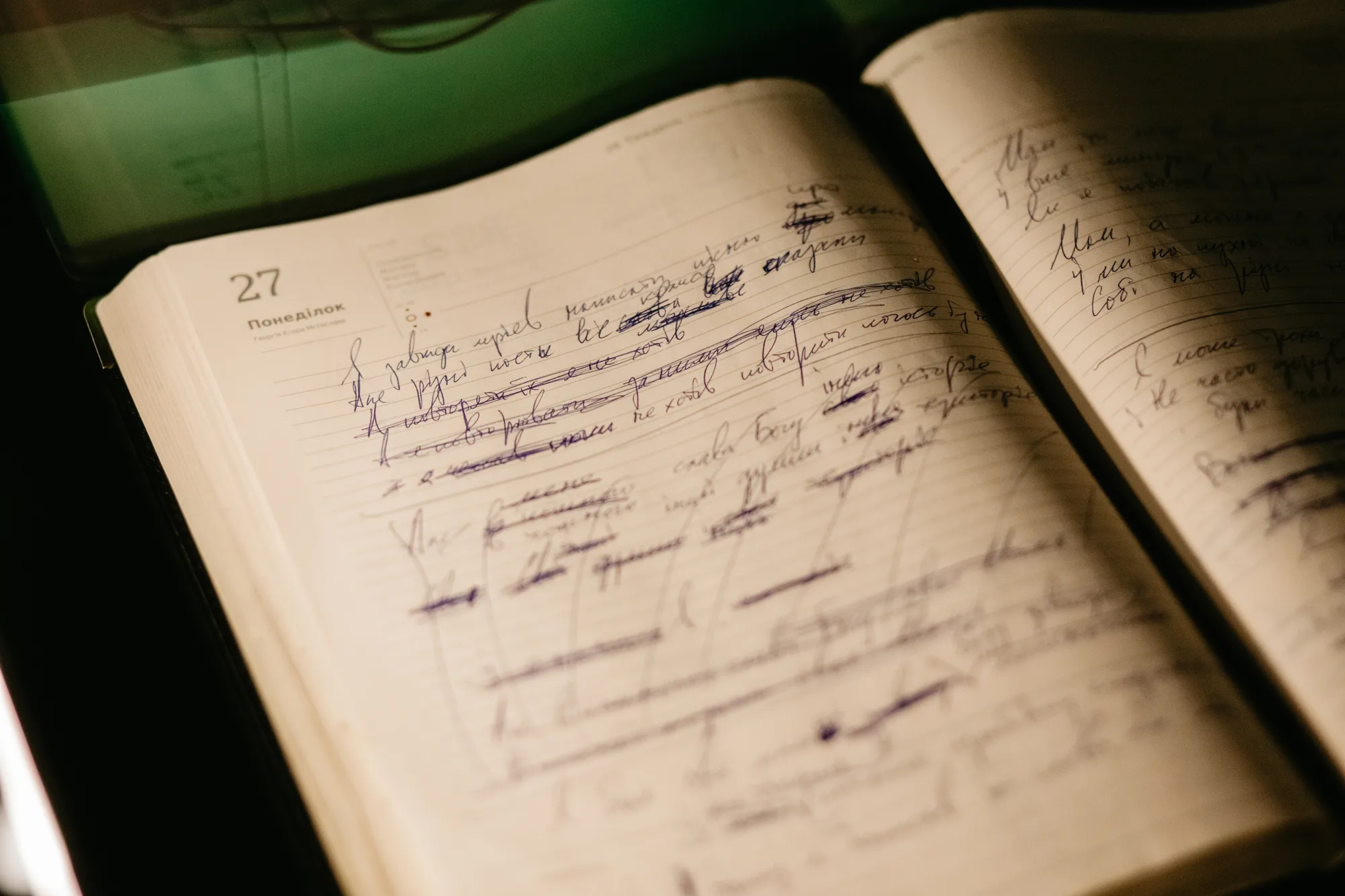 Серед експонатів, зокрема, рукописні тексти пісень Андрія Кузьменка, більш відомого як Кузьма Скрябін. У блокноті видно виправлення, перекреслені рядки, нові слова, вписані поверх старих. Поруч лежить невеликий динамік у формі старої телефонної трубки. Якщо підняти його до вуха, можна почути запис пісні "Мам".