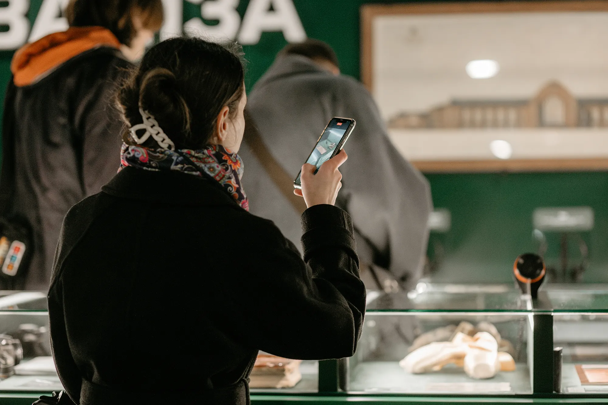 Біля "Культурної валізи" зупиняється жінка з рюкзаком. Спочатку повагавшись, вона все ж ступає у простір виставки. Незнайомка довго читає підписи до експонатів, слухає одну з історій у навушниках і, зрештою, повертається до малюнка з козаками.