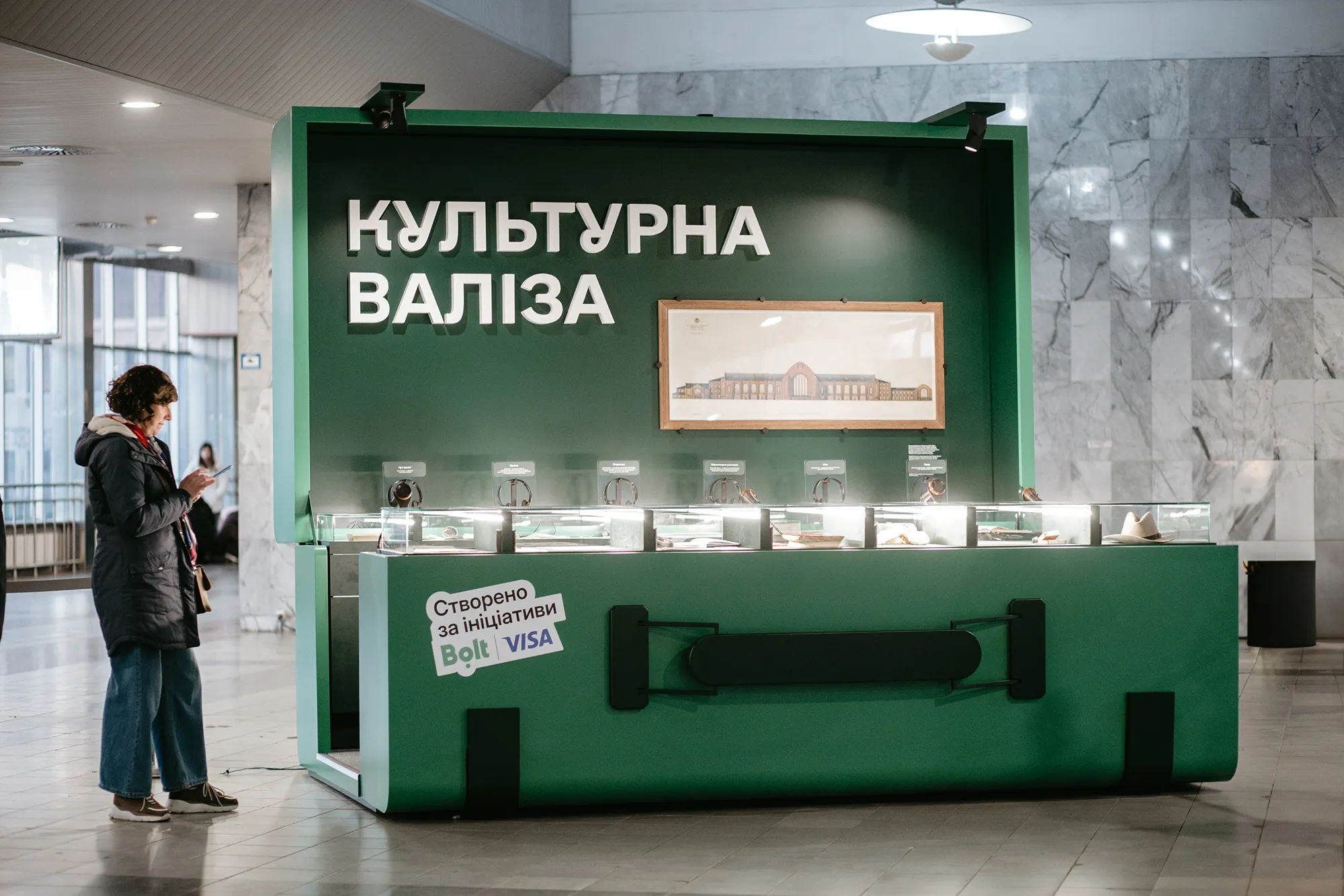 "Культурну валізу" розмістили в місці, де щодня проходять тисячі людей, що їдуть у дорогу, повертаються додому або чекають на повернення близьких. Тому зелений колір для "валізи" обрали не випадково – брендовий відтінок відсилає до бренду Bolt, що поєднує людей і місця.