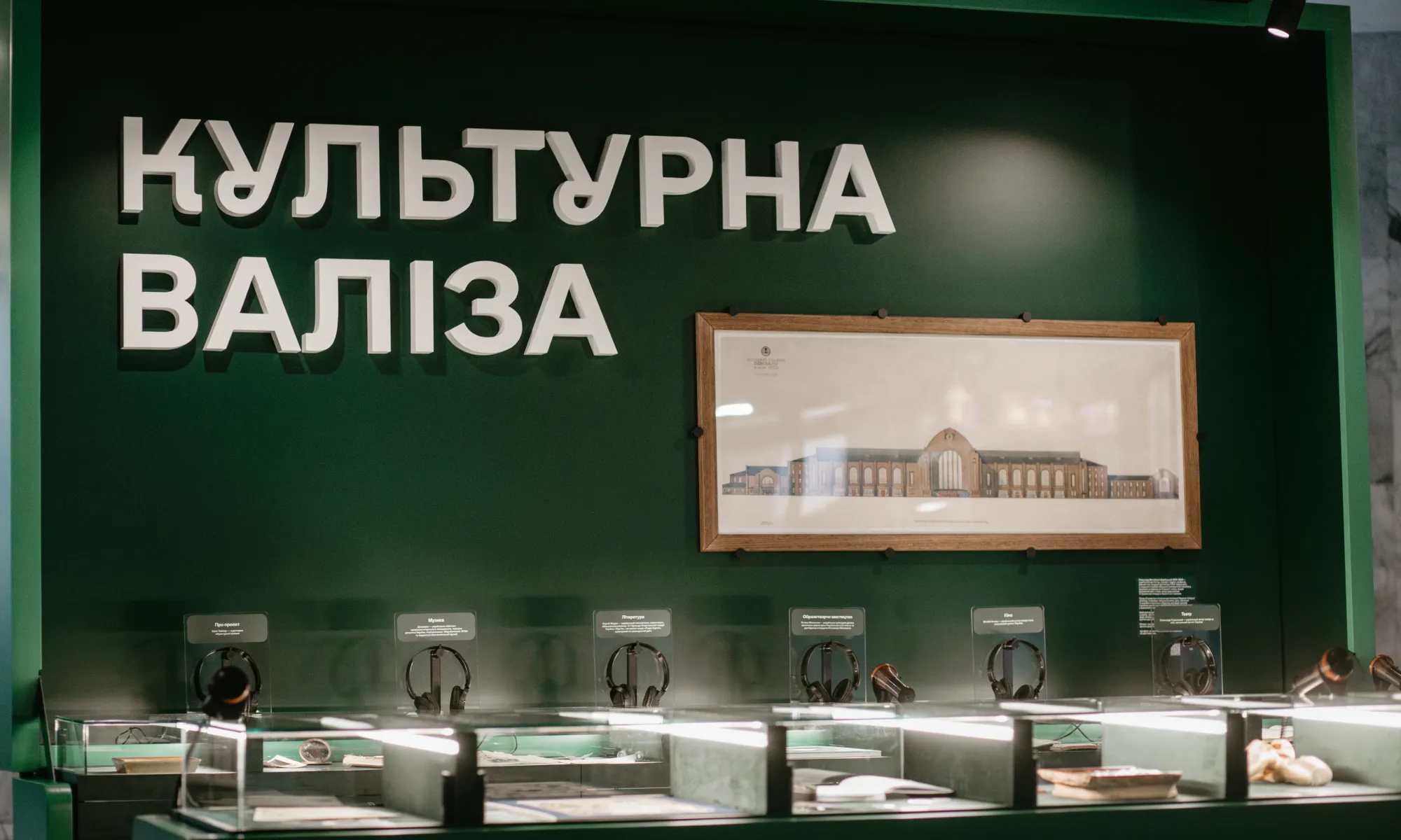 Окрему частину експозиції займають предмети, пов’язані з історією самого вокзалу. На стіні зеленої "валізи" висить ескіз фасаду Київського залізничного вокзалу, створений у межах архітектурного конкурсу 1927 року. Його автор – архітектор Олександр Вербицький. Елементи цього дизайну ми бачимо нині, попри те що під час Другої світової війни будівля київського вокзалу була частково зруйнована.