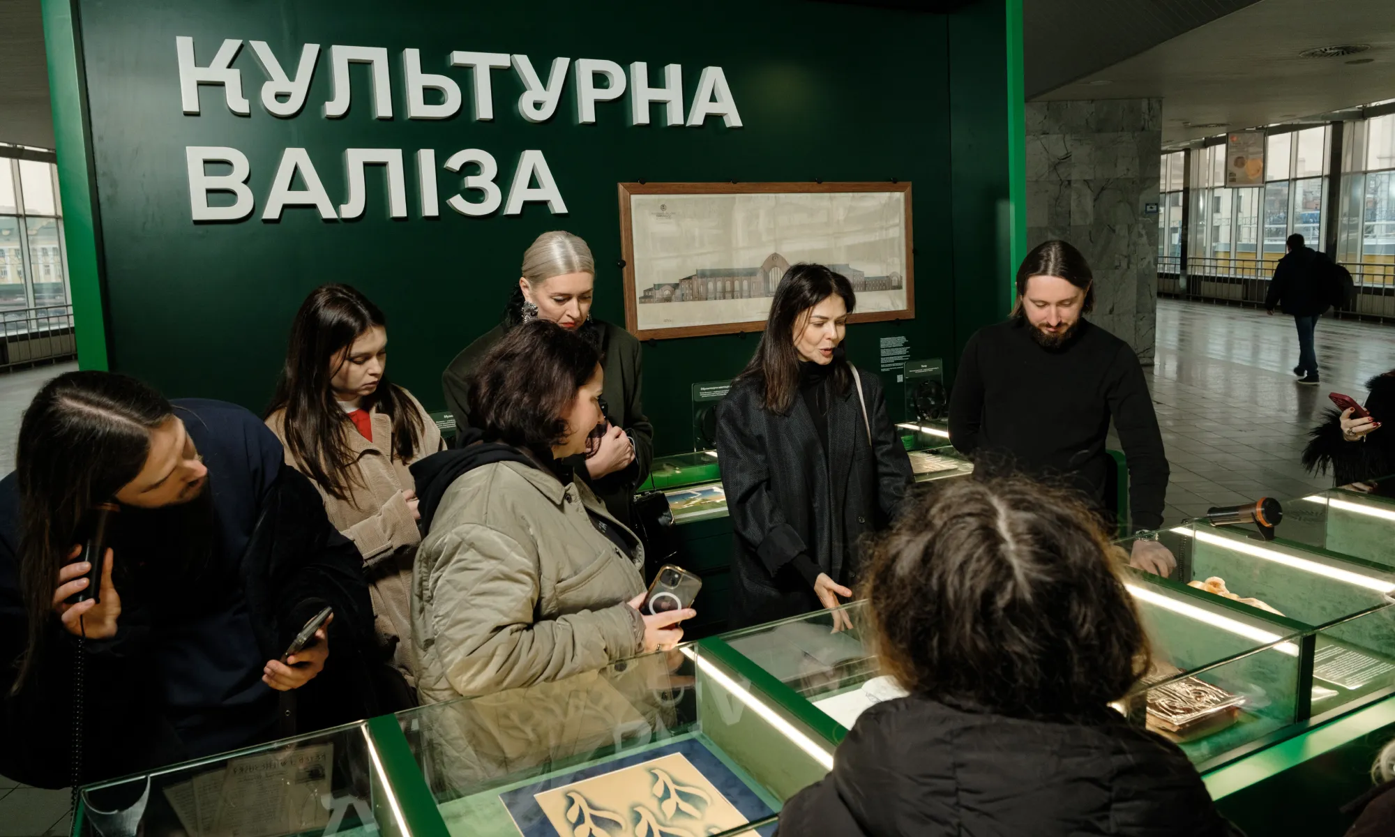 Картина висить у рамі, яка виглядає майже як дзеркало. У склі видно не лише сам малюнок, а й рух довкола: люди з валізами, що проходять повз, сонце, яке падає через великі вікна вокзалу, і небо над перонами. Архівний ескіз відбиває теперішній момент – ніби вокзал, який колись лише проєктували, продовжує жити в цьому самому просторі.