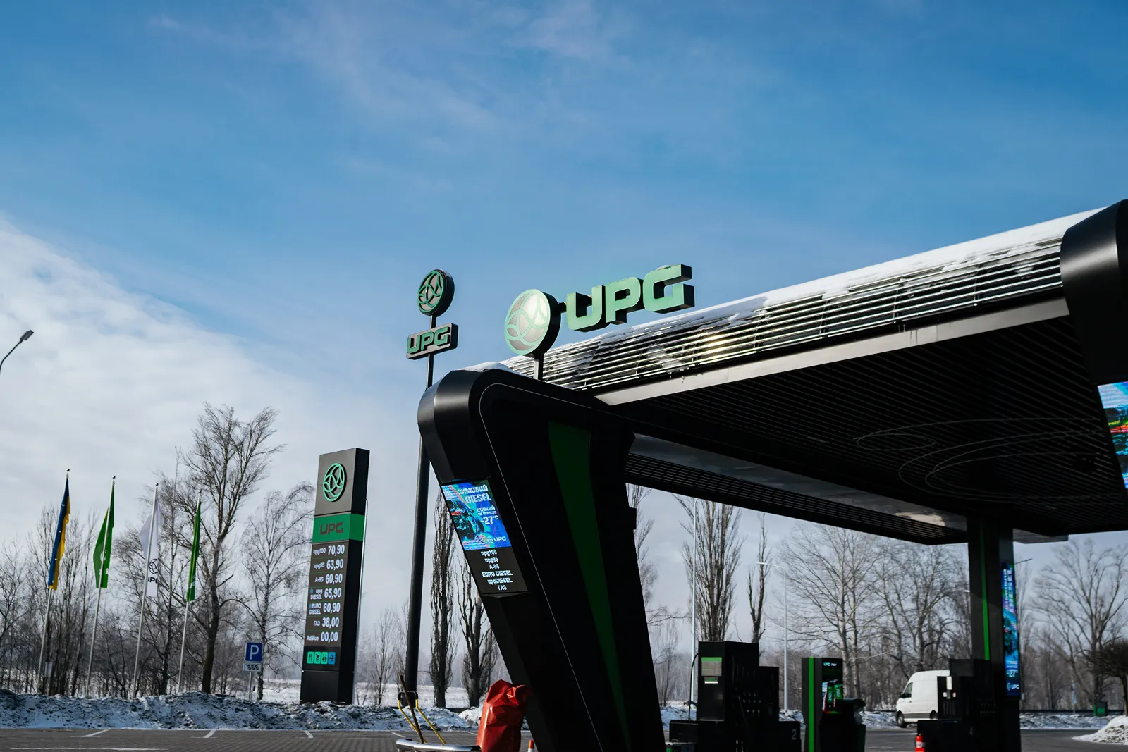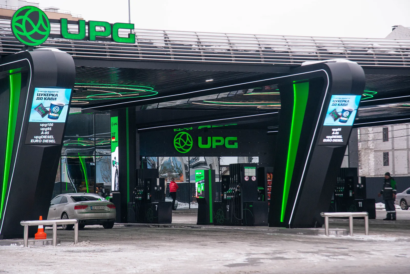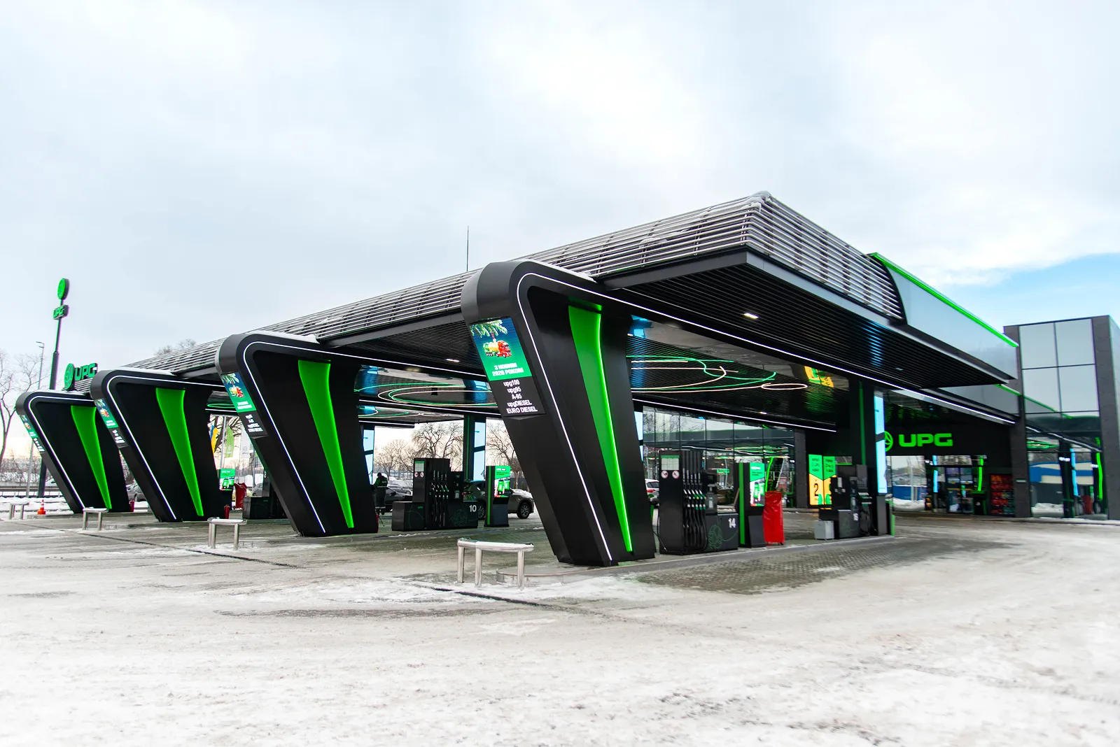 Наша перша зупинка – АЗК на вулиці Добробутній у Києві. Це один із найбільших заправно-відпочинкових комплексів мережі в столиці. Всередині АЗК все звично: відвідувачі розраховуються за пальне, замовляють каву та фірмові страви. Проте за кілька кроків від основної будівлі АЗК розташована монолітна споруда, яка вже стала звичною частиною ландшафту для місцевих жителів.