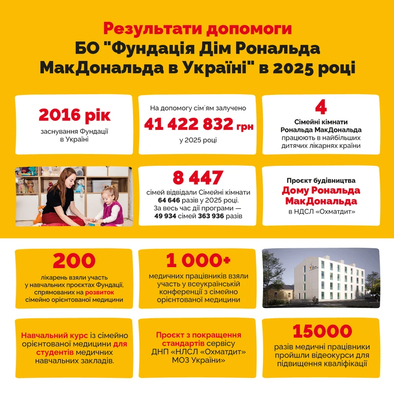 Фундація Дім Рональда МакДональда в Україні у 2025 році залучила понад 41,4 млн грн на підтримку родин із важкохворими дітьми, розширила програми допомоги та підготувалася до старту будівництва першого в країні Дому Рональда МакДональда в НДСЛ "Охматдит". Родини скористалися Сімейними кімнатами понад 64 тис. разів, а в освітніх програмах Фундації взяли участь понад 10 тис. медиків.