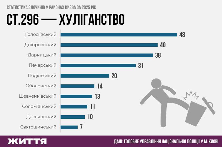 За кількістю грабежів торік лідирував Дарницький район, тоді як найбільше розбійних нападів зафіксували у Дніпровському. Найбільше випадків хуліганства зафіксували у Голосіївському районі.