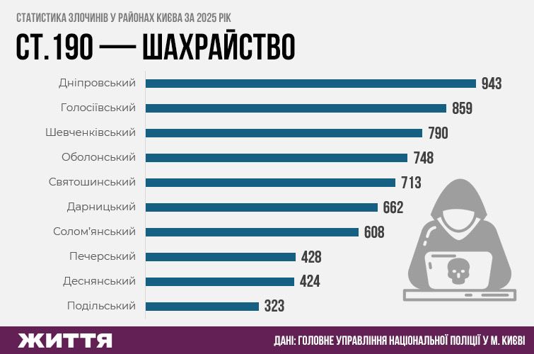 Найбільшу кількість кримінальних справ щодо крадіжок зареєстрували у Голосіївському районі, також високі показники – в Оболонському та Шевченківському. Щодо шахрайства – у Дніпровському, Голосіївському та Шевченківському районах.