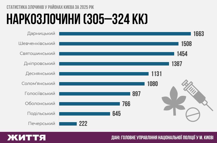 Найбільше наркозлочинів зафіксували у Дарницькому районі. Далі – Шевченківський, Святошинський та Дніпровський райони.