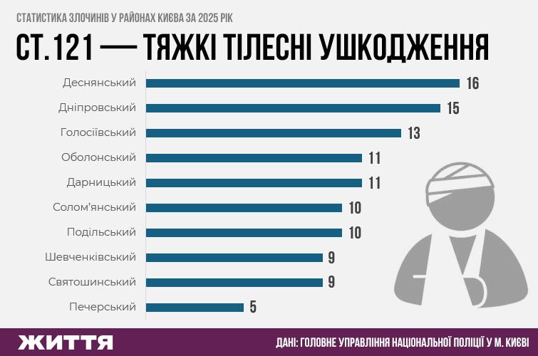 Найбільше умисних убивств у 2025 році виявили у Святошинському районі, а зґвалтувань – у Деснянському та Солом'янському районах столиці.