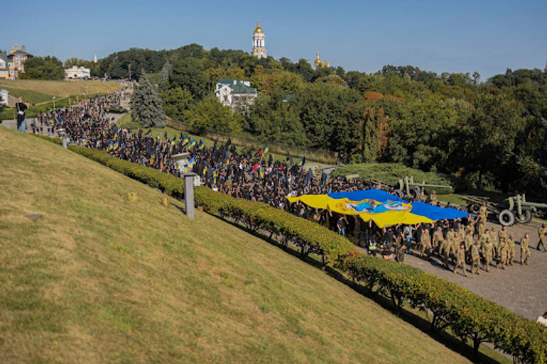 Після цього колони з прапорами та символікою "Тіні" пройшли центральними вулицями міст. Представники спільноти підняли прапори усіх підрозділів ГУР МО України: "Артану", "Шаманбату", "Легіону", "Кракена", підрозділів Тимура та "Кабул 9". У Києві хода завершилася урочистим розвішуванням прапора ГУР МО України на будівлі Національного музею історії України у Другій світовій війні.Меморіальний комплекс.