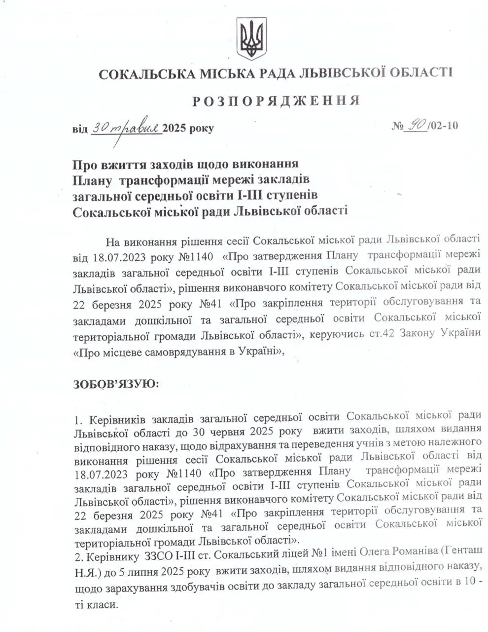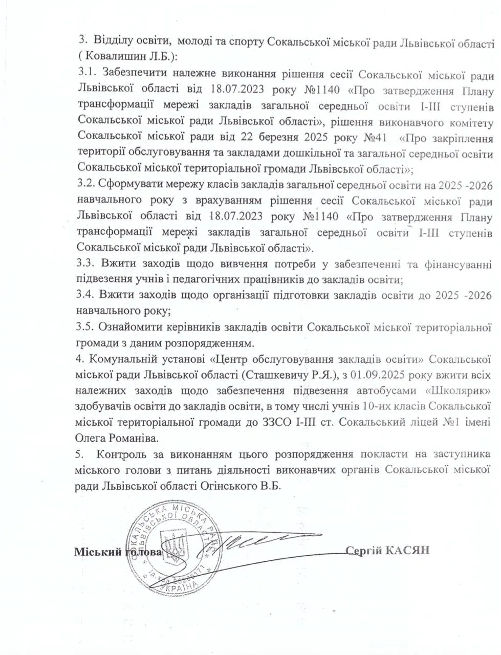 30 травня 2025 року міський голова Сергій Касян видав розпорядження, за яким директори усіх шкіл громади повинні видати накази про відрахування та переведення учнів 10 класів.