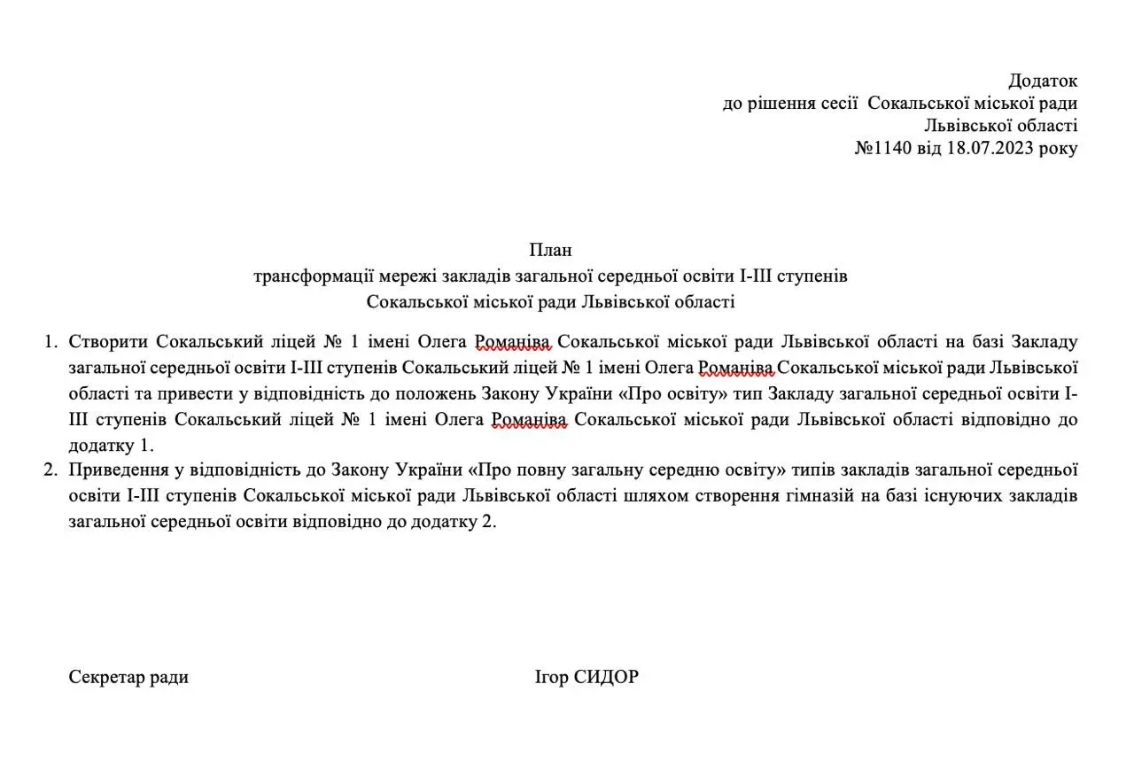 План трансформації затвердили рішенням міської ради Сокаля від 18 липня 2023 року. Він зокрема передбачає заснування Сокальського ліцею №1 імені Олега Романіва на базі загальноосвітньої школи №1. Натомість інші школи стануть гімназіями, в яких здобуватимуть освіту учні 1-9 класів.